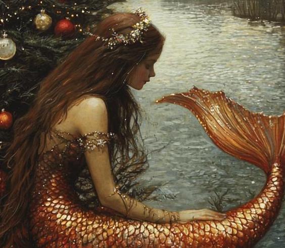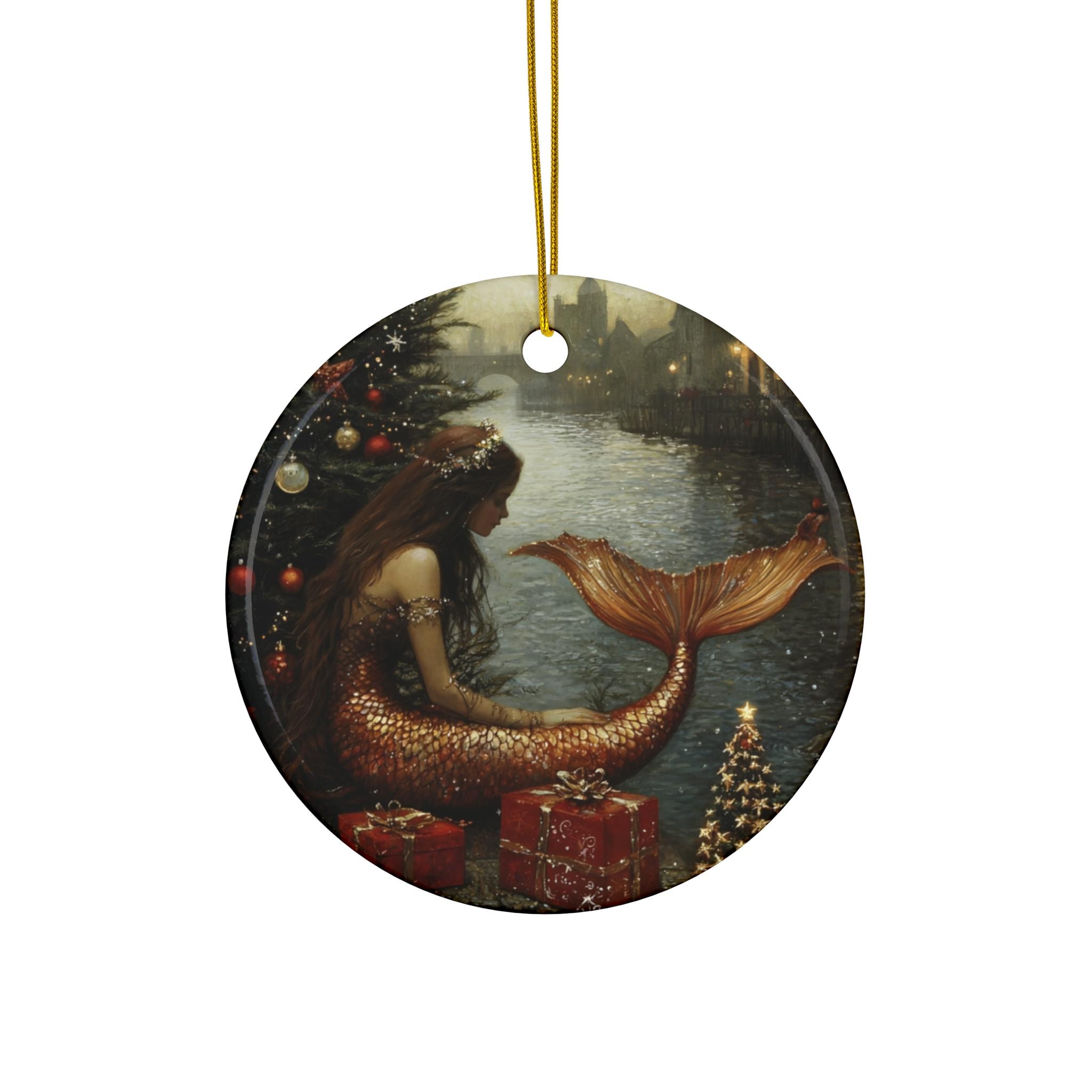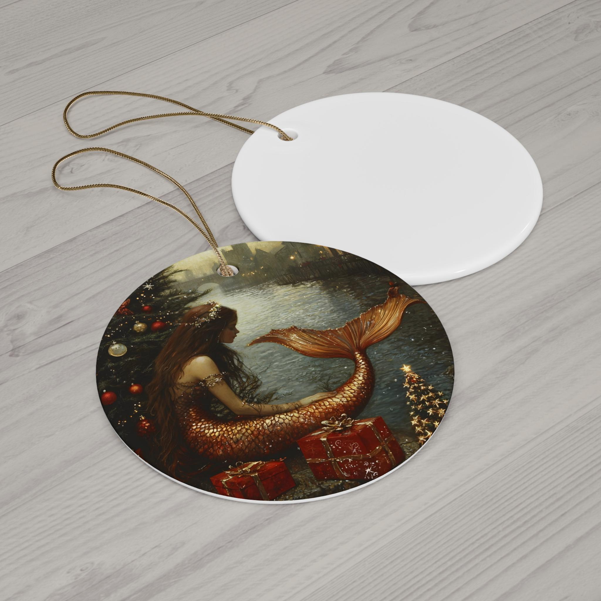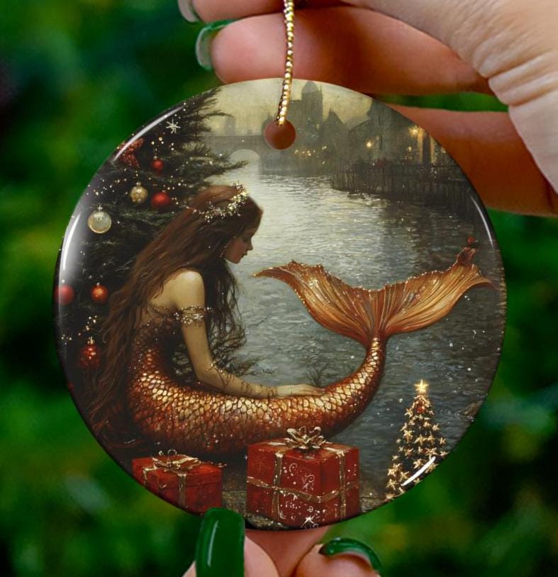 Mermaid Christmas ornament with vibrant colors and glossy finish is perfect for adding a touch of whimsy to your holiday decor. Ideal for mermaid lovers and those who enjoy unique ornaments for their Christmas tree or home decor.