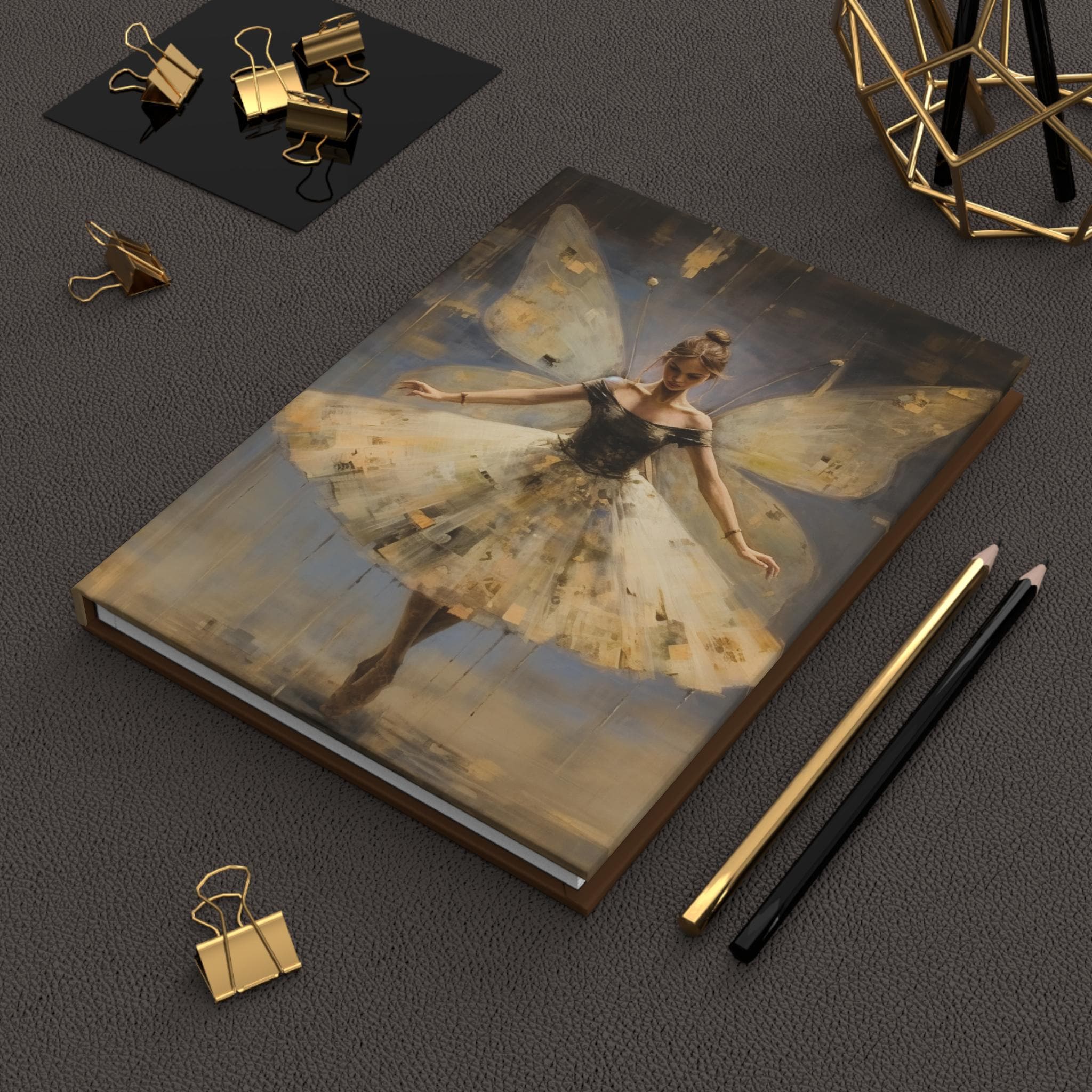 This hardcover journal wraps a quiet, painterly ballet scene in a durable matte cover — a tactile companion for anyone who keeps ideas, rehearsals, or small confessions close. The cover’s soft-laminated finish mutes glare and deepens the golden, cream, and dusk-blue tones of the artwork while a sewn casewrap binding lets the book open flat and feel lived-in. Inside, 150 lined pages with perforations give space for daily notes, choreography sketches, or lyrical fragments you might tear away and share. The full-wrap print makes the image flow uninterrupted across front and back, and a subtle production barcode on the back keeps the aesthetic understated and gallery-ready.